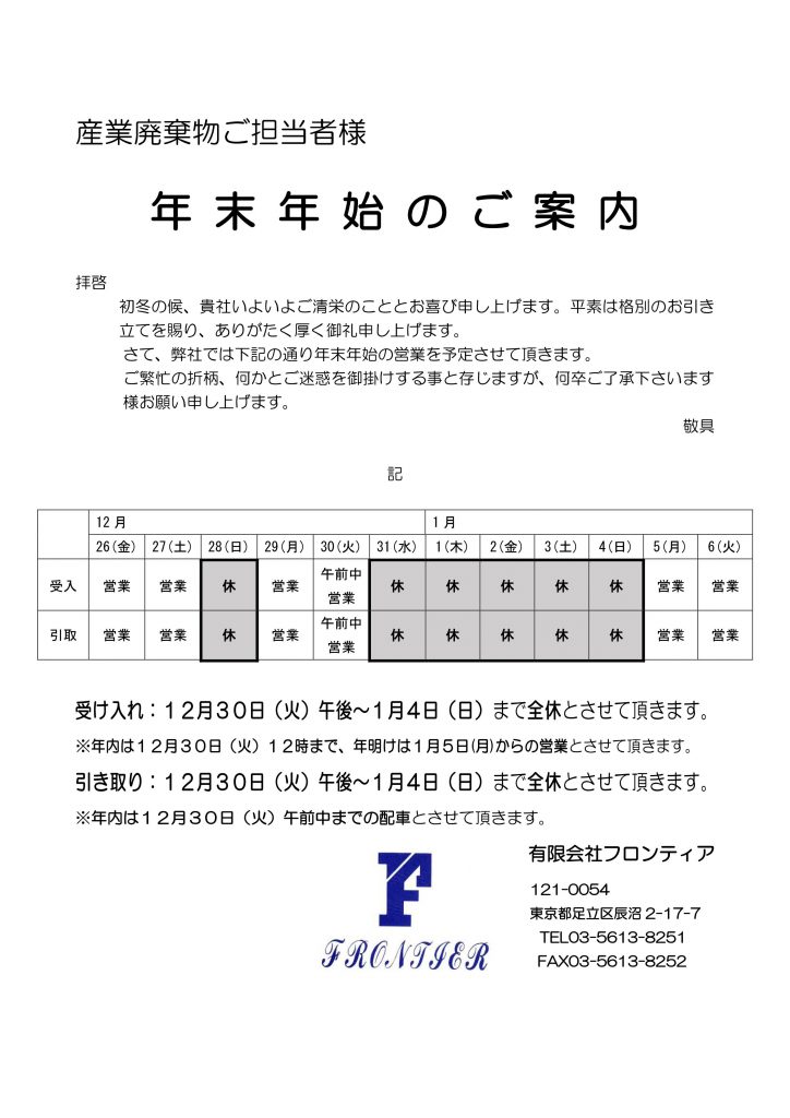 さて、産業廃棄物のお持ち込み、収集運搬について、下記の通り年末年始の営業を致します。