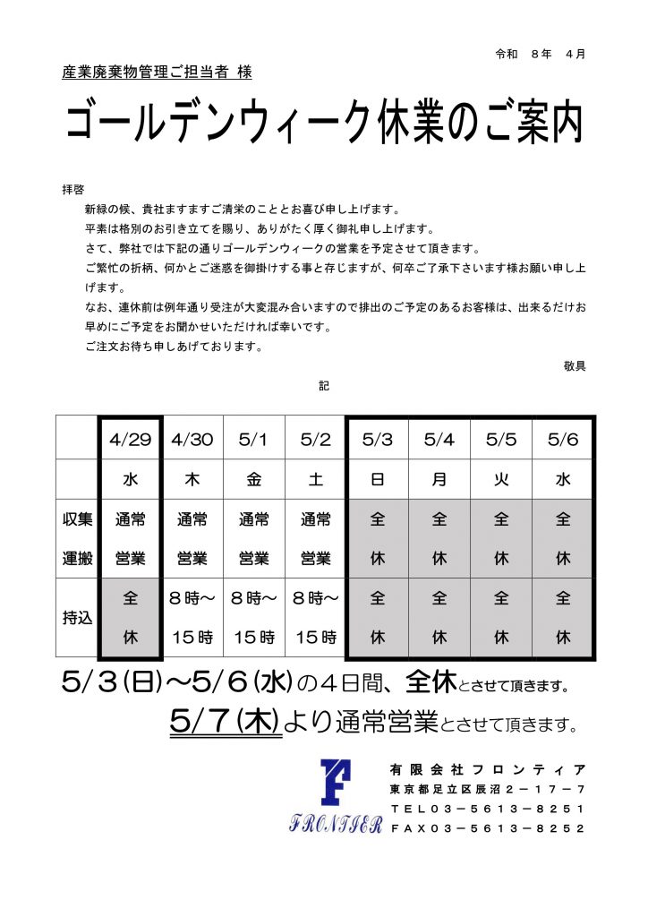 なお、連休前は例年通り受注が大変混み合いますので排出のご予定のあるお客様は、できるだけ早めにご予定をお聞かせ下さい。